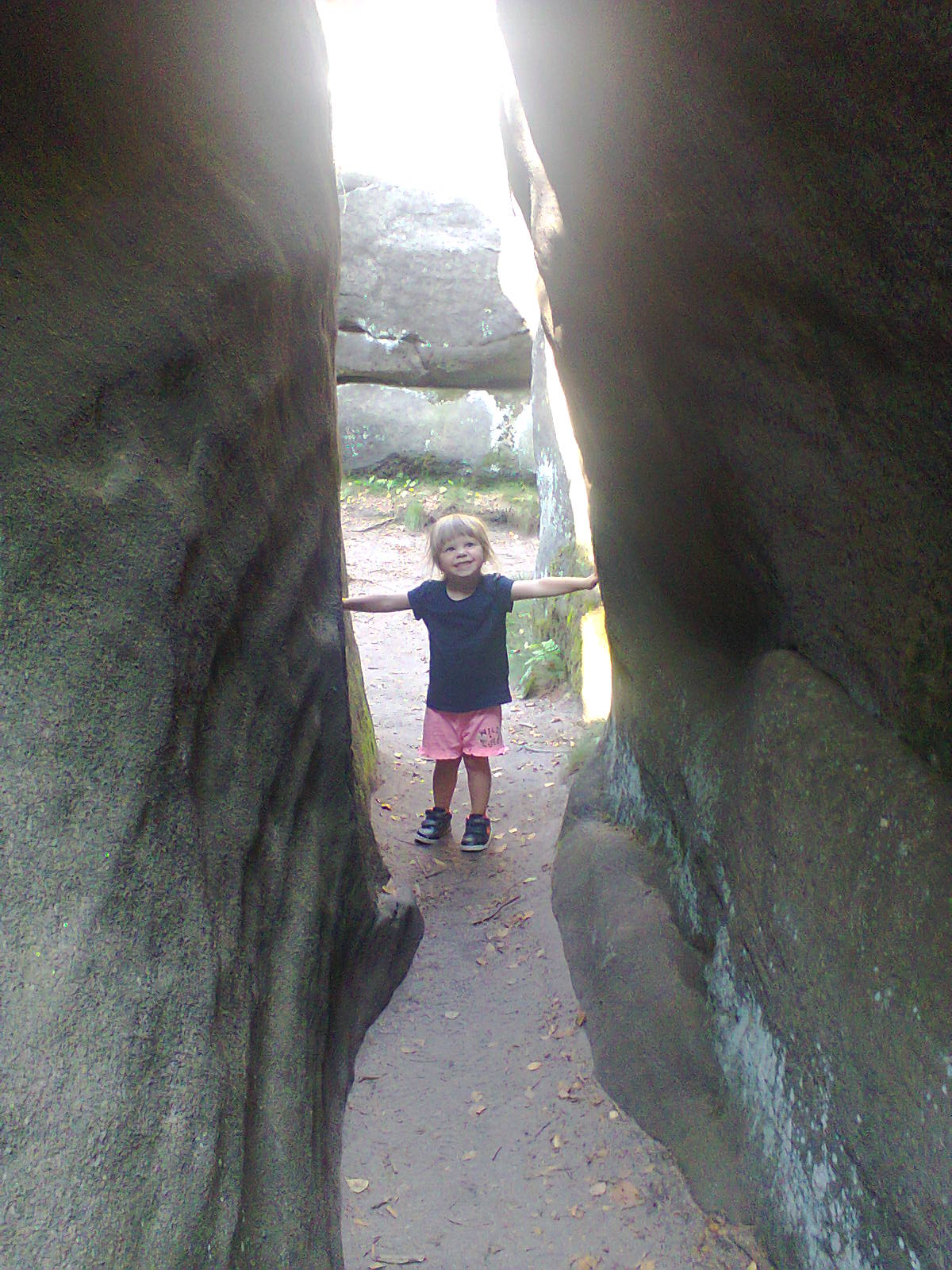 Moje skoro tříletá praneteř Agátka je šikulka. Na výletě do Broumovských skal se jen tak opřela o dva skalní bloky.. a už je mezi nimi cestička :) :) Fotila Jitka.
